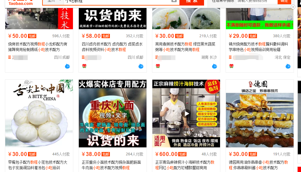 大家可以看一下这些卖小吃教程的,里面就是资料,一般都是视频+文档,看价格乘以销量(淘宝默认显示月销量),一个热门宝贝一个月进账几千块到万把块还是没啥问题的,有这么三五个爆款,小日子就很舒服了。